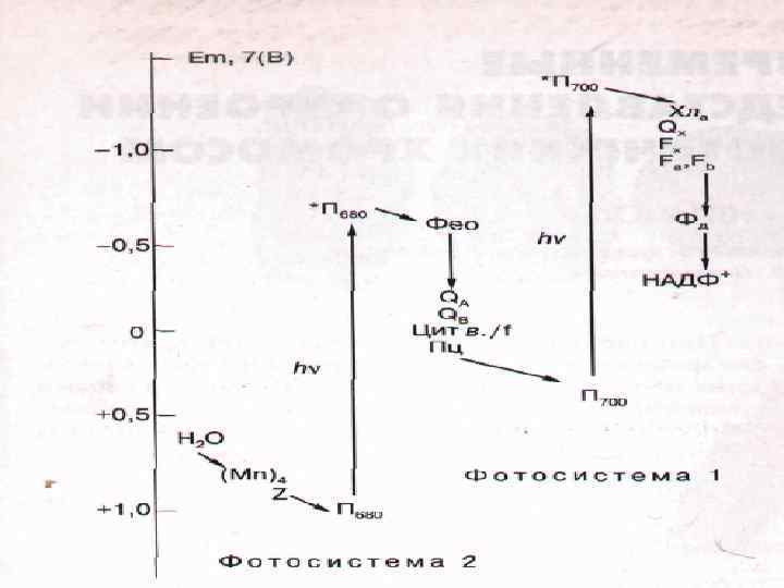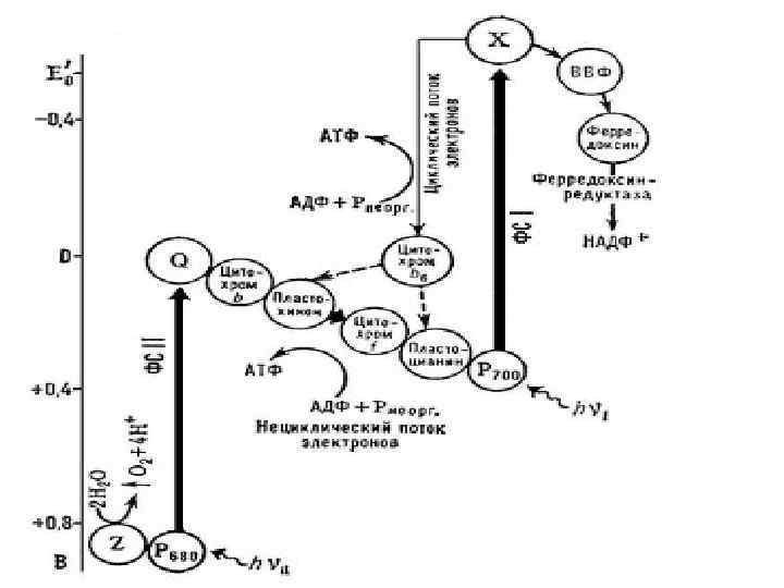 Первичное разделение зарядов Фотосистема I П 700 + ē → П 700* Фотосистема II П 680 + ē → П 680* П 700* + Ао → П 700+ + Ао - П 680*+ Фео → П 680 + + Фео- хлорофилл→ хлорофилл * → ē + Хл +