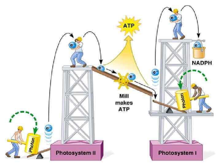 IV. Световые реакции фотосинтеза Фотофизический этап фотосинтеза Реакции поглощения энергии пигментами, запасания ее в виде электронного возбуждения и миграции в реакционный центр Есвета → Еэл. возбуждения Процессы быстрые. Скорость 10 -15 - 10 -16 с. Фотохимический этап фотосинтеза Биохимические процессы, в ходе которых образуется сильный восстановитель HAДФН, синтезируется АТФ, а при фотоокислении воды в виде побочного продукта выделяется О 2. Дальнейшее преобразование поглощенной энергии. Образуются вещества, богатые энергией. Еэл. возбуждения → Ехим. св. (АТФ).