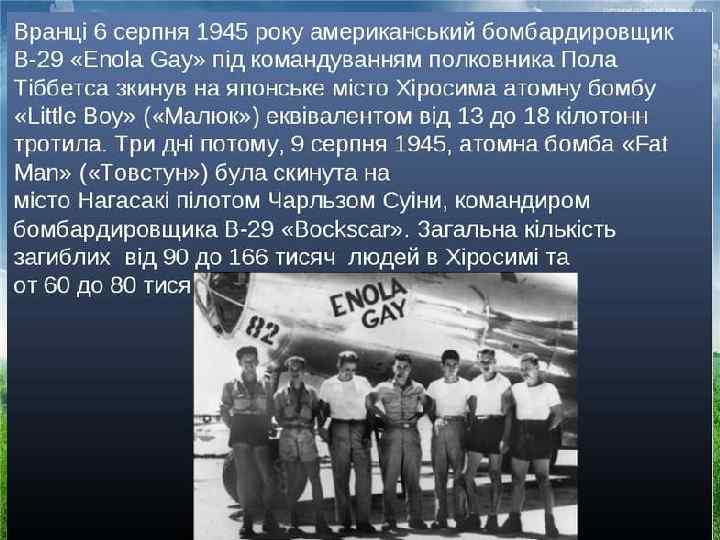 Літак, із якого було скинуто на Хіросіму атомну бомбу, його командир полковник ВПС США Пол Тіббітс назвав "Енола Гей", на честь своєї матері. А корпус "малюка", кількома годинами пізніше забрав життя сотень тисяч японців, був списаний написами, на зразок радянських "На Берлін!" - на снарядах і бомбах, відомих за