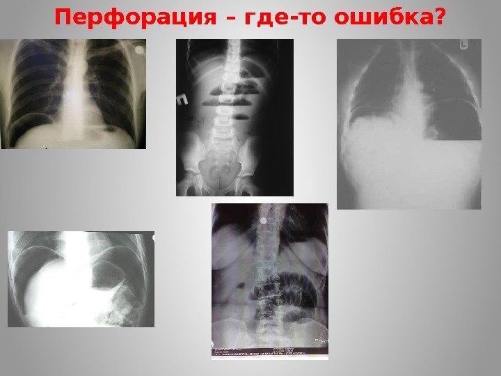 Перфорация Надежнее определить свободный газ с по-мощью обзорной рент-генографии брюшной полости в вертикальном или горизонтальном по-ложении