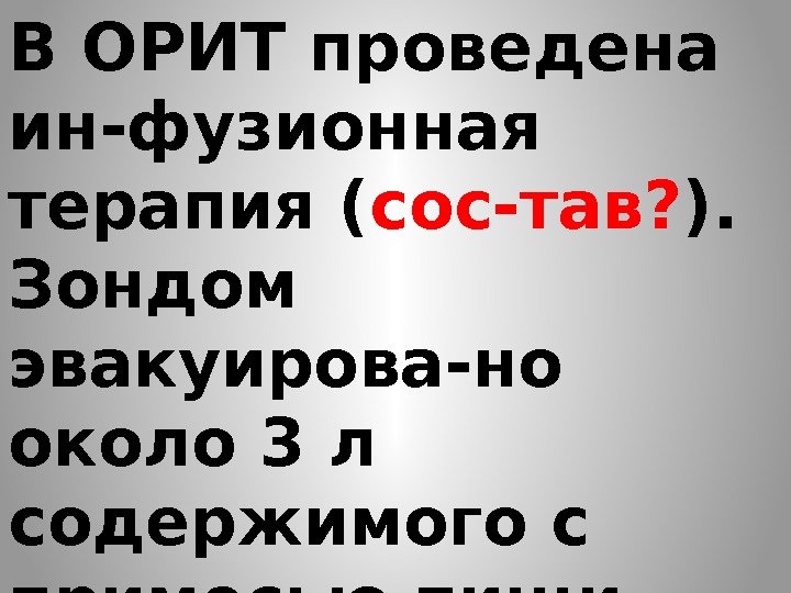 В ОРИТ проведена ин-фузионная терапия ( сос-тав? ). Зондом эвакуирова-но около 3 л содержимого с примесью пищи. Зонд оставлен на сутки. Судо-роги прекратились.