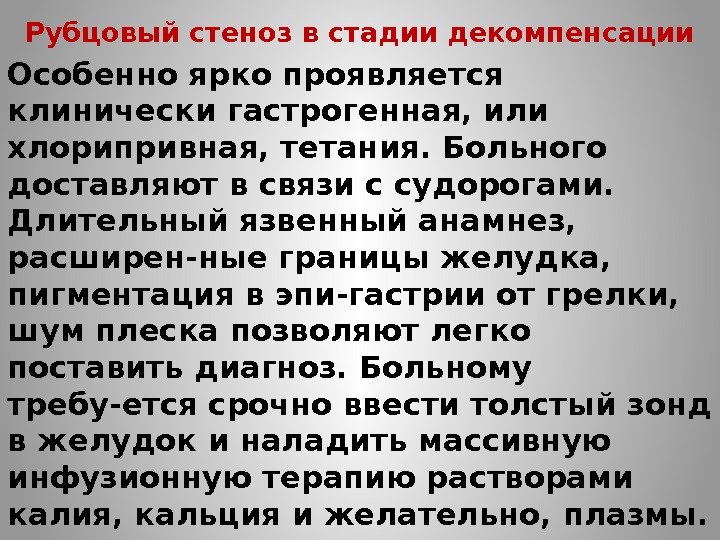 Рубцовый стеноз в стадии декомпенсации Особенно ярко проявляется клинически гастрогенная, или хлорипривная, тетания. Больного доставляют в связи с судорогами. Длительный язвенный анамнез, расширен-ные границы желудка, пигментация в эпи-гастрии от грелки, шум плеска позволяют легко поставить диагноз. Больному требу-ется срочно ввести толстый зонд в желудок и наладить массивную инфузионную терапию растворами калия, кальция и желательно, плазмы.