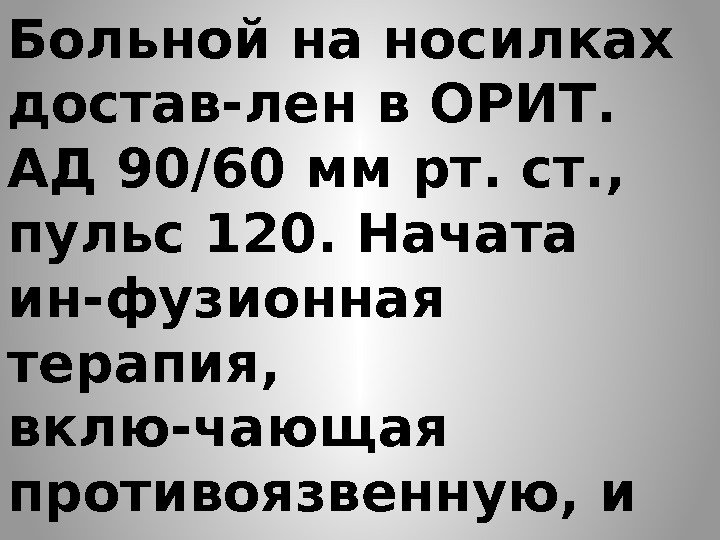 Больной на носилках достав-лен в ОРИТ. АД 90/60 мм рт. ст. , пульс 120. Начата ин-фузионная терапия, вклю-чающая противоязвенную, и выполнена срочная эндоско-пия. Применен эндоскопи-ческий гемостаз.