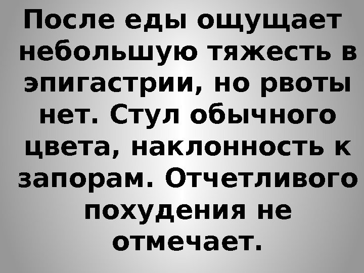 После еды ощущает небольшую тяжесть в эпигастрии, но рвоты нет. Стул обычного цвета, наклонность к запорам. Отчетливого похудения не отмечает.