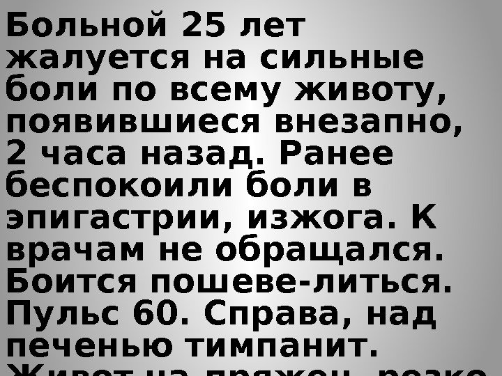Больной 25 лет жалуется на сильные боли по всему животу, появившиеся внезапно, 2 часа назад. Ранее беспокоили боли в эпигастрии, изжога. К врачам не обращался. Боится пошеве-литься. Пульс 60. Справа, над печенью тимпанит. Живот на-пряжен, резко болезнен. Симп-том Щеткина-Блюмберга поло-жителен.