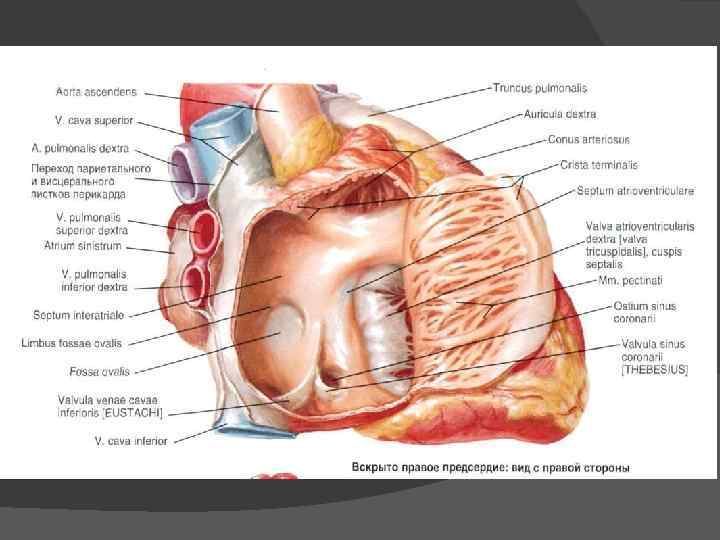 Правое предсердие Синус полых вен + мыш. валики + Межвенозный бугорок Лоуэра Евтахиева заслонка Устье коронарного синуса + Тебезиева заслонка Ушко ПП (вид треугольника) + гребенчатые мышцы Пограничный гребень (соотв. пограничная борозда) МПП (овальная ямка, перешеек Вьессена, сух. Тодаро, АВ-перегородка-промежут. ) Правое предсердно-желуд. отверстие + Трикус