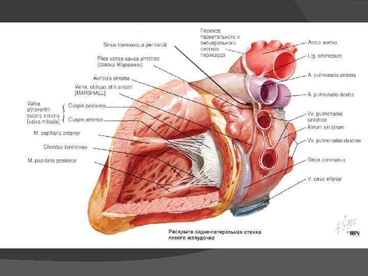 Левое предсердие Форма неправильного цилиндра Впадают: Легочные вены (+кольцевидные мышечные валики вокруг ЛВ) Наименьшие вены (тебез. ) Ушко ЛП (пальцевидной формы) + гребенчатые мышцы МПП Лев. Предсердно-желуд. Отверстие + Бикус