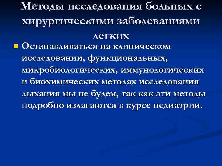 Методы исследования больных с хирургическими заболеваниями легких n Останавливаться на клиническом исследовании, функциональных, микробиологических, иммунологических и биохимических методах исследования дыхания мы не будем, так как эти методы подробно излагаются в курсе педиатрии.
