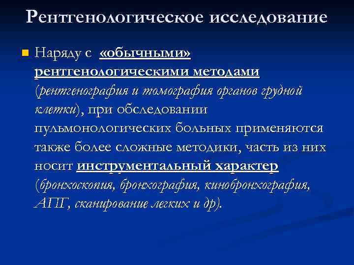 Рентгенологическое исследование n Наряду с «обычными» рентгенологическими методами (рентгенография и томография органов грудной клетки), при обследовании пульмонологических больных применяются также более сложные методики, часть из них носит инструментальный характер (бронхоскопия, бронхография, кинобронхография, АПГ, сканирование легких и др).