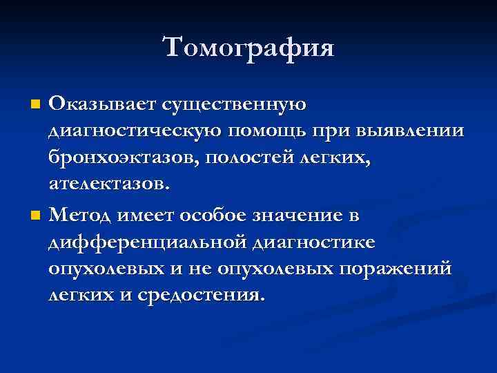 Томография n Оказывает существенную диагностическую помощь при выявлении бронхоэктазов, полостей легких, ателектазов. n Метод имеет особое значение в дифференциальной диагностике опухолевых и не опухолевых поражений легких и средостения.