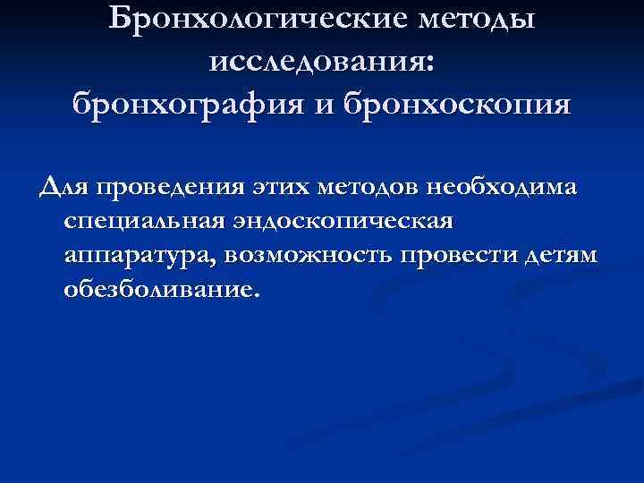 Бронхологические методы исследования: бронхография и бронхоскопия Для проведения этих методов необходима специальная эндоскопическая аппаратура, возможность провести детям обезболивание.