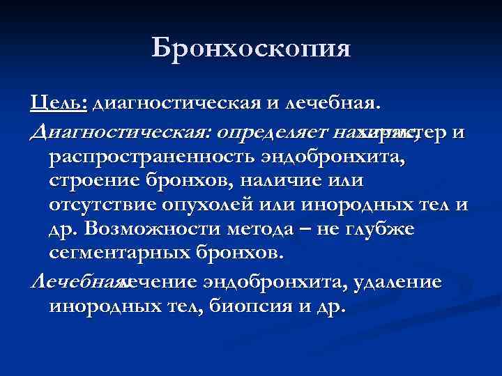 Бронхоскопия Цель: диагностическая и лечебная. Диагностическая: определяет наличие, и характер распространенность эндобронхита, строение бронхов, наличие или отсутствие опухолей или инородных тел и др. Возможности метода – не глубже сегментарных бронхов. Лечебная: лечение эндобронхита, удаление инородных тел, биопсия и др.
