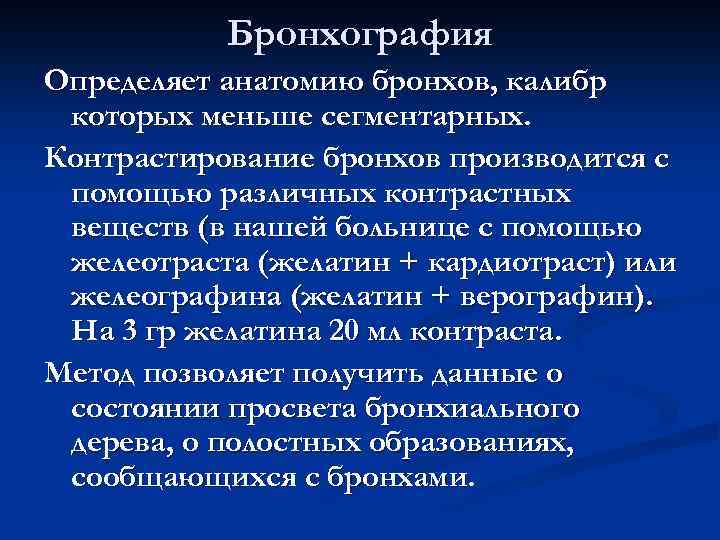 Бронхография Определяет анатомию бронхов, калибр которых меньше сегментарных. Контрастирование бронхов производится с помощью различных контрастных веществ (в нашей больнице с помощью желеотраста (желатин + кардиотраст) или желеографина (желатин + верографин). На 3 гр желатина 20 мл контраста. Метод позволяет получить данные о состоянии просвета бронхиального дерева, о полостных образованиях, сообщающихся с бронхами.