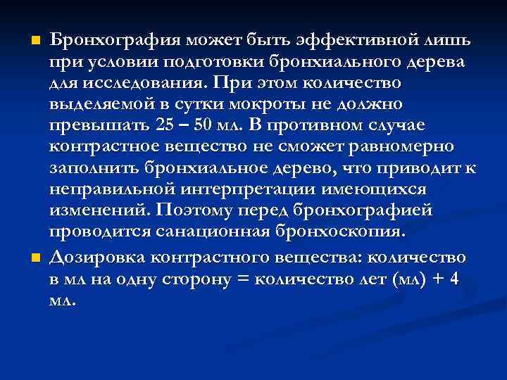 n Бронхография может быть эффективной лишь при условии подготовки бронхиального дерева для исследования. При этом количество выделяемой в сутки мокроты не должно превышать 25 – 50 мл. В противном случае контрастное вещество не сможет равномерно заполнить бронхиальное дерево, что приводит к неправильной интерпретации имеющихся изменений. Поэтому перед бронхографией проводится санационная бронхоскопия. n Дозировка контрастного вещества: количество в мл на одну сторону = количество лет (мл) + 4 мл.