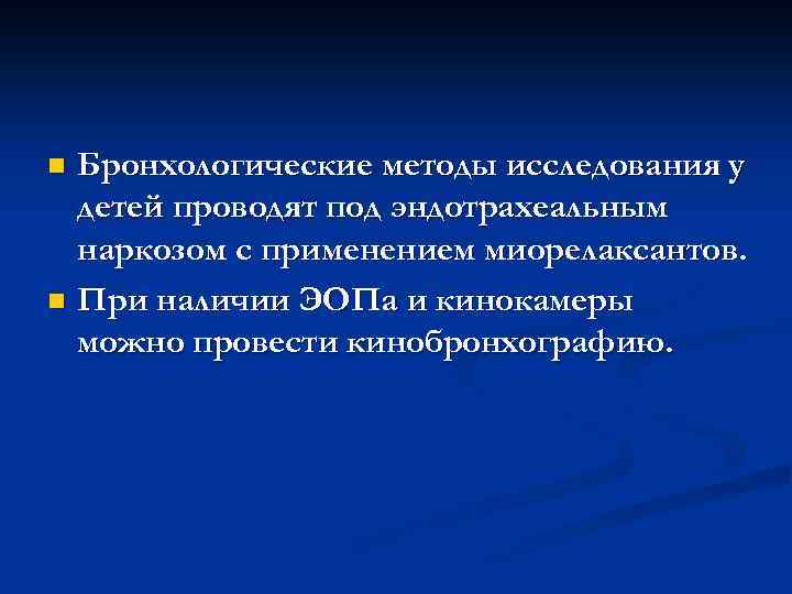 n Бронхологические методы исследования у детей проводят под эндотрахеальным наркозом с применением миорелаксантов. n При наличии ЭОПа и кинокамеры можно провести кинобронхографию.