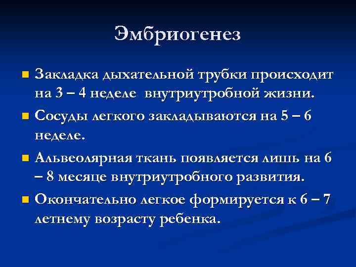 Эмбриогенез n Закладка дыхательной трубки происходит на 3 – 4 неделе внутриутробной жизни. n Сосуды легкого закладываются на 5 – 6 неделе. n Альвеолярная ткань появляется лишь на 6 – 8 месяце внутриутробного развития. n Окончательно легкое формируется к 6 – 7 летнему возрасту ребенка.