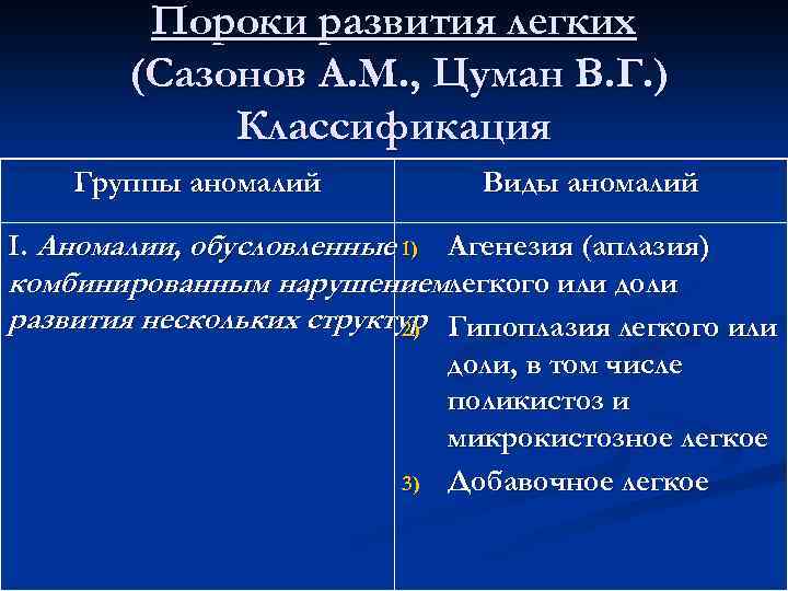Пороки развития легких (Сазонов А. М. , Цуман В. Г. ) Классификация Группы аномалий Виды аномалий I. Аномалии, обусловленные 1) Агенезия (аплазия) комбинированным нарушениемлегкого или доли развития нескольких структур Гипоплазия легкого или 2) доли, в том числе поликистоз и микрокистозное легкое 3) Добавочное легкое