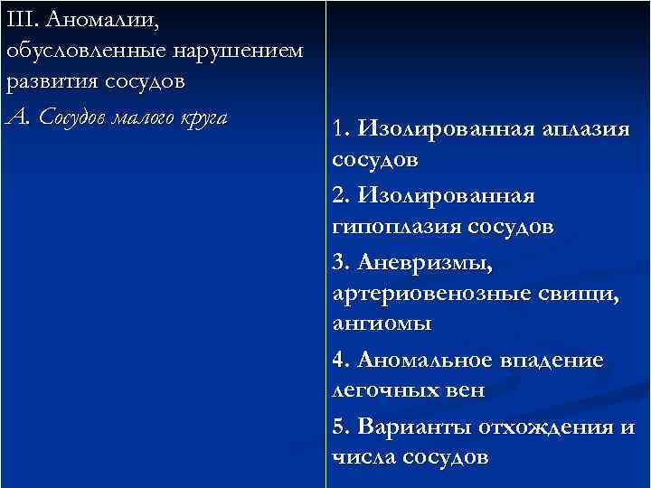 III. Аномалии, обусловленные нарушением развития сосудов А. Сосудов малого круга 1. Изолированная аплазия сосудов 2. Изолированная гипоплазия сосудов 3. Аневризмы, артериовенозные свищи, ангиомы 4. Аномальное впадение легочных вен 5. Варианты отхождения и числа сосудов