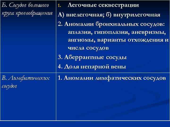 Б. Сосудов большого 1. Легочные секвестрации круга кровообращения А) внелегочная; б) внутрилегочная 2. Аномалии бронхиальных сосудов: аплазия, гипоплазия, аневризмы, ангиомы, варианты отхождения и числа сосудов 3. Аберрантные сосуды 4. Доля непарной вены В. Лимфатических 1. Аномалии лимфатических сосудов