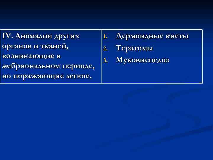 IV. Аномалии других 1. Дермоидные кисты органов и тканей, 2. Тератомы возникающие в 3. Муковисцедоз эмбриональном периоде, но поражающие легкое.