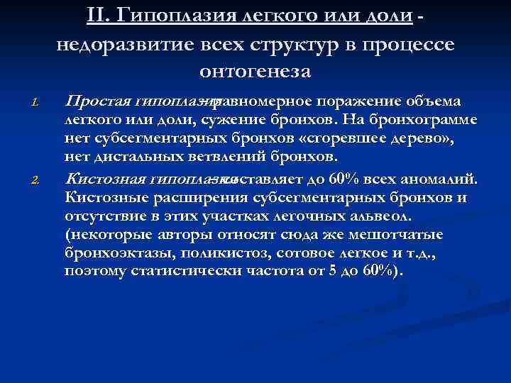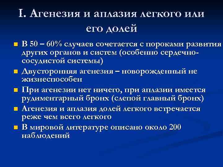 I. Агенезия и аплазия легкого или его долей n В 50 – 60% случаев сочетается с пороками развития других органов и систем (особенно сердечно- сосудистой системы) n Двусторонняя агенезия – новорожденный не жизнеспособен n При агенезии нет ничего, при аплазии имеется рудиментарный бронх (слепой главный бронх) n Агенезия и аплазия долей легкого встречается реже чем всего легкого n В мировой литературе описано около 200 наблюдений