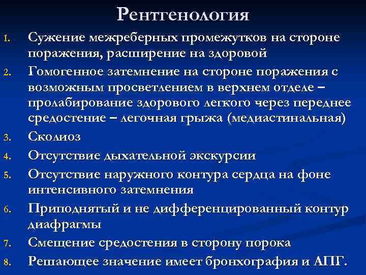 Рентгенология n Затемнение и смещение средостения в больную сторону, иногда медиастинальная грыжа. n Бронхограмма – бронхоэктазы и АПГ.