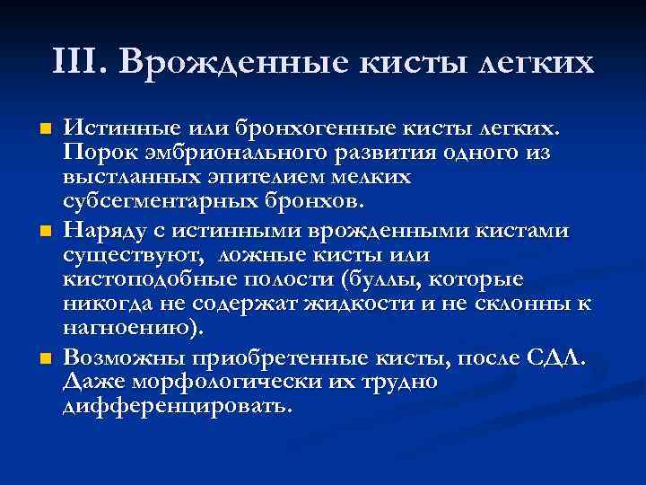 III. Врожденные кисты легких n Истинные или бронхогенные кисты легких. Порок эмбрионального развития одного из выстланных эпителием мелких субсегментарных бронхов. n Наряду с истинными врожденными кистами существуют, ложные кисты или кистоподобные полости (буллы, которые никогда не содержат жидкости и не склонны к нагноению). n Возможны приобретенные кисты, после СДЛ. Даже морфологически их трудно дифференцировать.