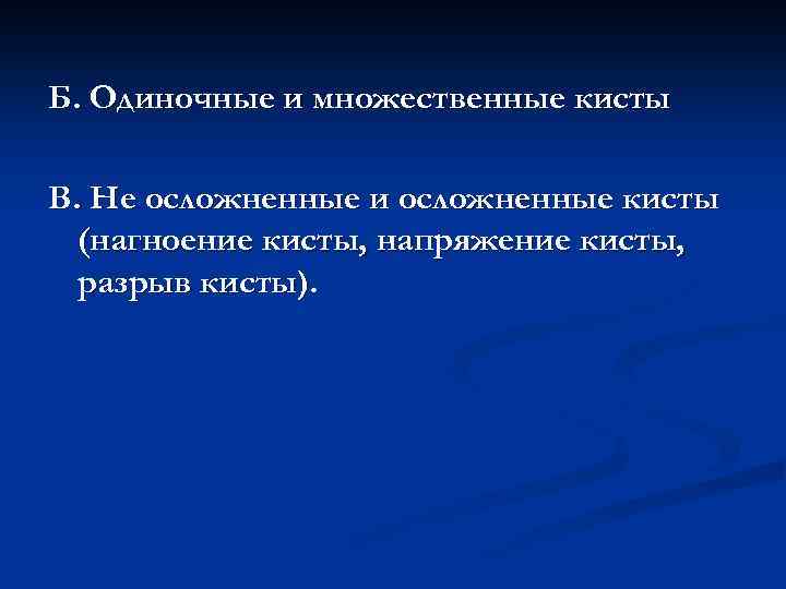 Б. Одиночные и множественные кисты В. Не осложненные и осложненные кисты (нагноение кисты, напряжение кисты, разрыв кисты).