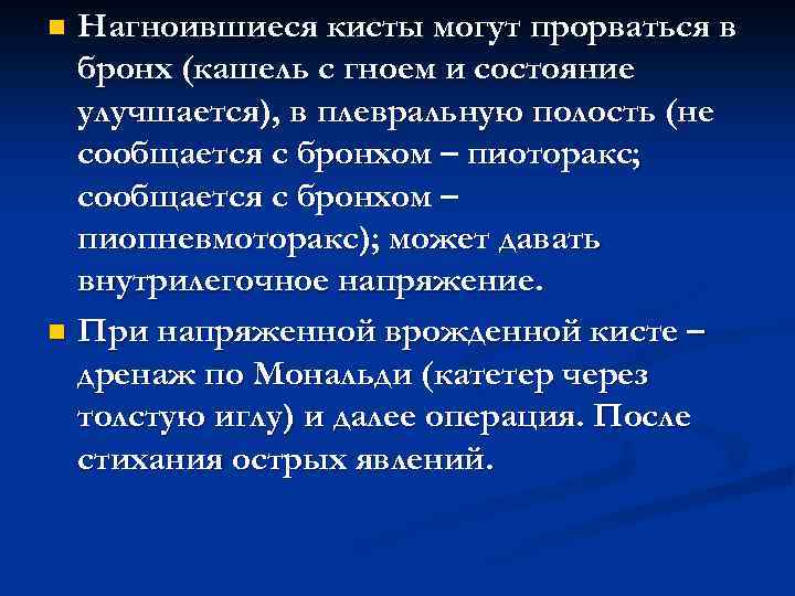 n Нагноившиеся кисты могут прорваться в бронх (кашель с гноем и состояние улучшается), в плевральную полость (не сообщается с бронхом – пиоторакс; сообщается с бронхом – пиопневмоторакс); может давать внутрилегочное напряжение. n При напряженной врожденной кисте – дренаж по Мональди (катетер через толстую иглу) и далее операция. После стихания острых явлений.
