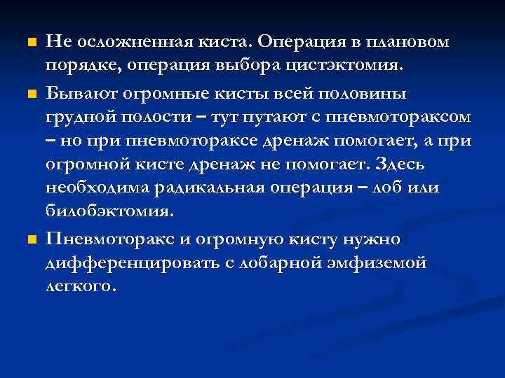 n Не осложненная киста. Операция в плановом порядке, операция выбора цистэктомия. n Бывают огромные кисты всей половины грудной полости – тут путают с пневмотораксом – но при пневмотораксе дренаж помогает, а при огромной кисте дренаж не помогает. Здесь необходима радикальная операция – лоб или билобэктомия. n Пневмоторакс и огромную кисту нужно дифференцировать с лобарной эмфиземой легкого.