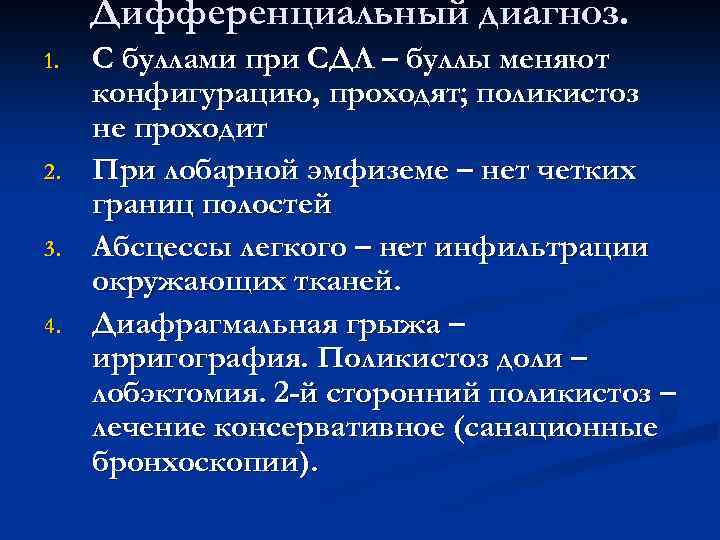 Дифференциальный диагноз. 1. С буллами при СДЛ – буллы меняют конфигурацию, проходят; поликистоз не проходит 2. При лобарной эмфиземе – нет четких границ полостей 3. Абсцессы легкого – нет инфильтрации окружающих тканей. 4. Диафрагмальная грыжа – ирригография. Поликистоз доли – лобэктомия. 2 -й сторонний поликистоз – лечение консервативное (санационные бронхоскопии).