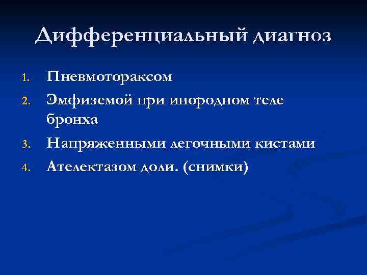 Дифференциальный диагноз 1. Пневмотораксом 2. Эмфиземой при инородном теле бронха 3. Напряженными легочными кистами 4. Ателектазом доли. (снимки)