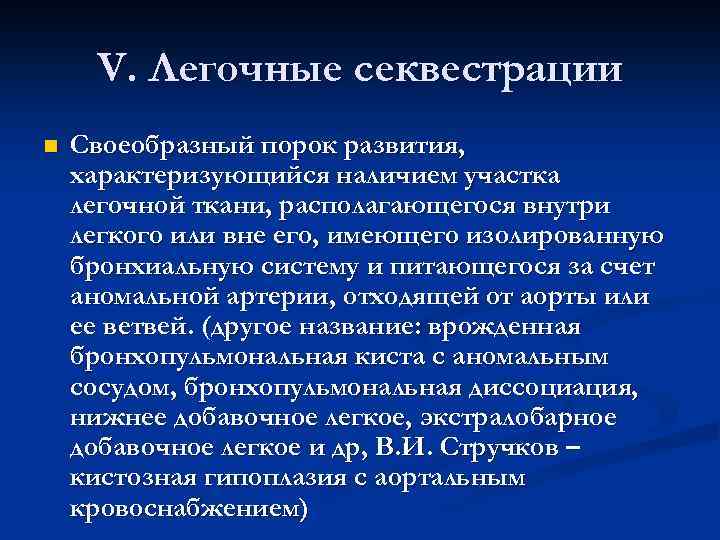V. Легочные секвестрации n Своеобразный порок развития, характеризующийся наличием участка легочной ткани, располагающегося внутри легкого или вне его, имеющего изолированную бронхиальную систему и питающегося за счет аномальной артерии, отходящей от аорты или ее ветвей. (другое название: врожденная бронхопульмональная киста с аномальным сосудом, бронхопульмональная диссоциация, нижнее добавочное легкое, экстралобарное добавочное легкое и др, В. И. Стручков – кистозная гипоплазия с аортальным кровоснабжением)