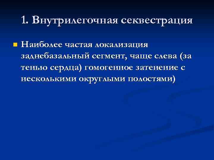 1. Внутрилегочная секвестрация n Наиболее частая локализация заднебазальный сегмент, чаще слева (за тенью сердца) гомогенное затенение с несколькими округлыми полостями)