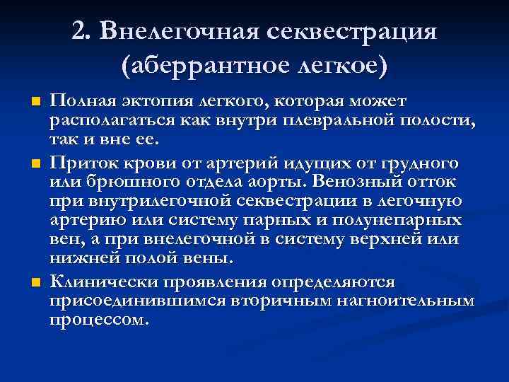 2. Внелегочная секвестрация (аберрантное легкое) n Полная эктопия легкого, которая может располагаться как внутри плевральной полости, так и вне ее. n Приток крови от артерий идущих от грудного или брюшного отдела аорты. Венозный отток при внутрилегочной секвестрации в легочную артерию или систему парных и полунепарных вен, а при внелегочной в систему верхней или нижней полой вены. n Клинически проявления определяются присоединившимся вторичным нагноительным процессом.