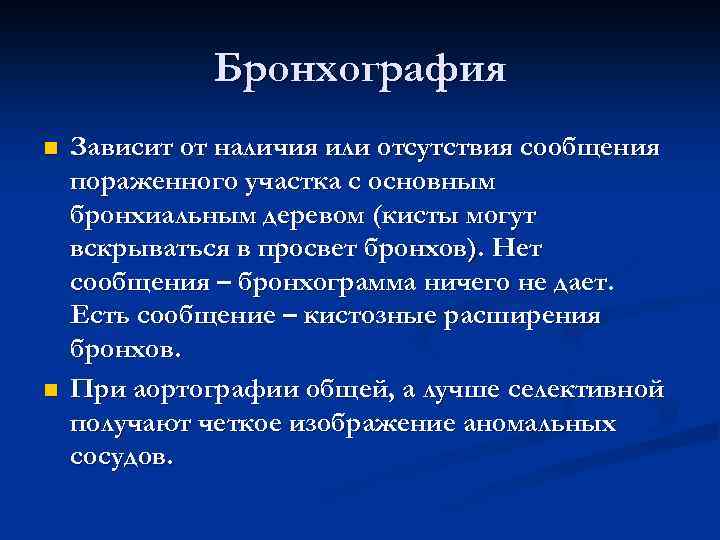 Бронхография n Зависит от наличия или отсутствия сообщения пораженного участка с основным бронхиальным деревом (кисты могут вскрываться в просвет бронхов). Нет сообщения – бронхограмма ничего не дает. Есть сообщение – кистозные расширения бронхов. n При аортографии общей, а лучше селективной получают четкое изображение аномальных сосудов.