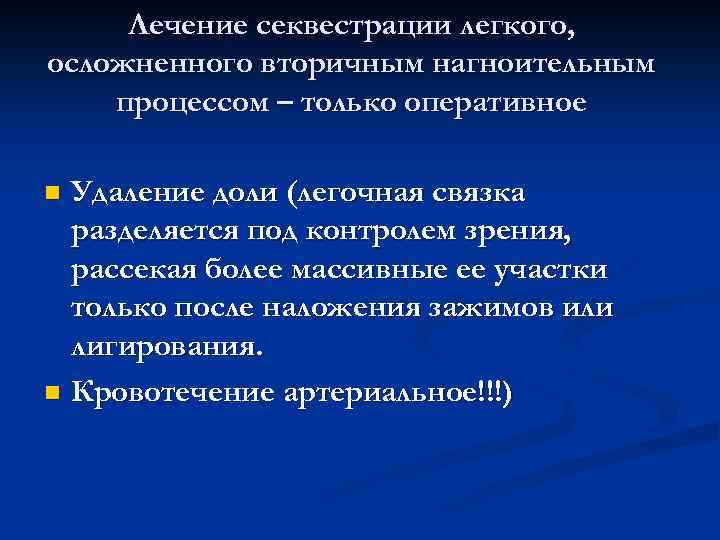Лечение секвестрации легкого, осложненного вторичным нагноительным процессом – только оперативное n Удаление доли (легочная связка разделяется под контролем зрения, рассекая более массивные ее участки только после наложения зажимов или лигирования. n Кровотечение артериальное!!!)