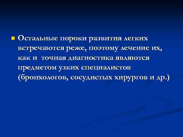 n Остальные пороки развития легких встречаются реже, поэтому лечение их, как и точная диагностика являются предметом узких специалистов (бронхологов, сосудистых хирургов и др. )