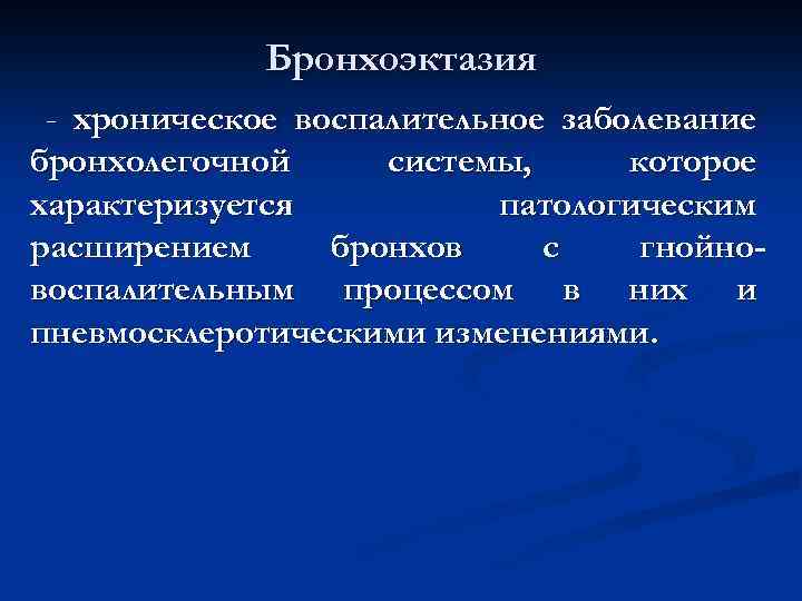 Бронхоэктазия - хроническое воспалительное заболевание бронхолегочной системы, которое характеризуется патологическим расширением бронхов с гнойно- воспалительным процессом в них и пневмосклеротическими изменениями.