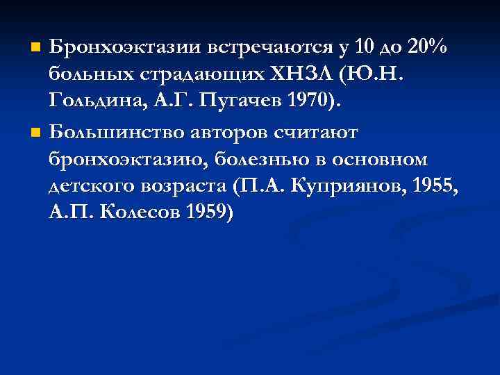 n Бронхоэктазии встречаются у 10 до 20% больных страдающих ХНЗЛ (Ю. Н. Гольдина, А. Г. Пугачев 1970). n Большинство авторов считают бронхоэктазию, болезнью в основном детского возраста (П. А. Куприянов, 1955, А. П. Колесов 1959)