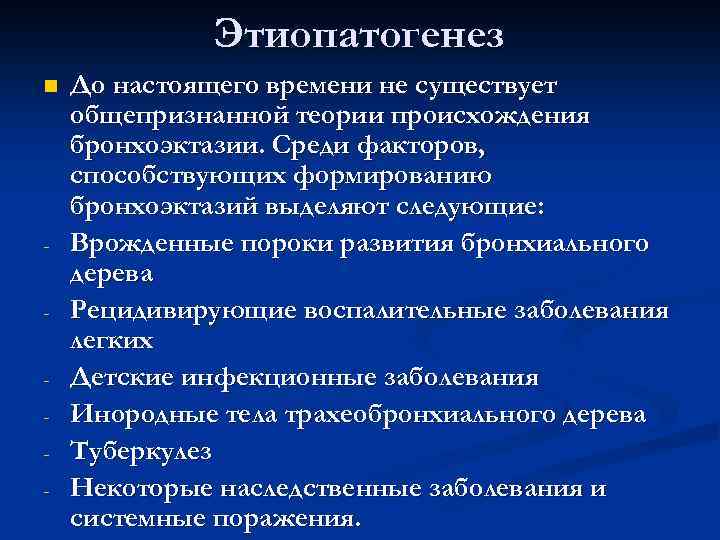 Этиопатогенез n До настоящего времени не существует общепризнанной теории происхождения бронхоэктазии. Среди факторов, способствующих формированию бронхоэктазий выделяют следующие: - Врожденные пороки развития бронхиального дерева - Рецидивирующие воспалительные заболевания легких - Детские инфекционные заболевания - Инородные тела трахеобронхиального дерева - Туберкулез - Некоторые наследственные заболевания и системные поражения.