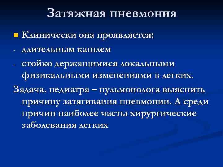 Затяжная пневмония n Клинически она проявляется: - длительным кашлем - стойко держащимися локальными физикальными изменениями в легких. Задача. педиатра – пульмонолога выяснить причину затягивания пневмонии. А среди причин наиболее часты хирургические заболевания легких