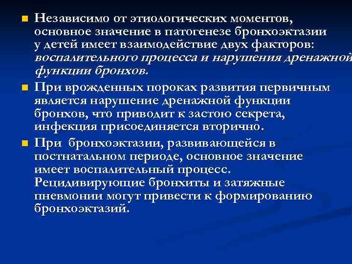 n Независимо от этиологических моментов, основное значение в патогенезе бронхоэктазии у детей имеет взаимодействие двух факторов: воспалительного процесса и нарушения дренажной функции бронхов. n При врожденных пороках развития первичным является нарушение дренажной функции бронхов, что приводит к застою секрета, инфекция присоединяется вторично. n При бронхоэктазии, развивающейся в постнатальном периоде, основное значение имеет воспалительный процесс. Рецидивирующие бронхиты и затяжные пневмонии могут привести к формированию бронхоэктазий.