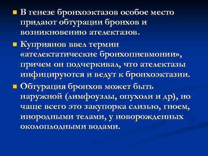 n В генезе бронхоэктазов особое место придают обтурации бронхов и возникновению ателектазов. n Куприянов ввел термин «ателектатические бронхопневмонии» , причем он подчеркивал, что ателектазы инфицируются и ведут к бронхоэктазии. n Обтурация бронхов может быть наружной (лимфоузлы, опухоли и др), но чаще всего это закупорка слизью, гноем, инородными телами, у новорожденных околоплодными водами.