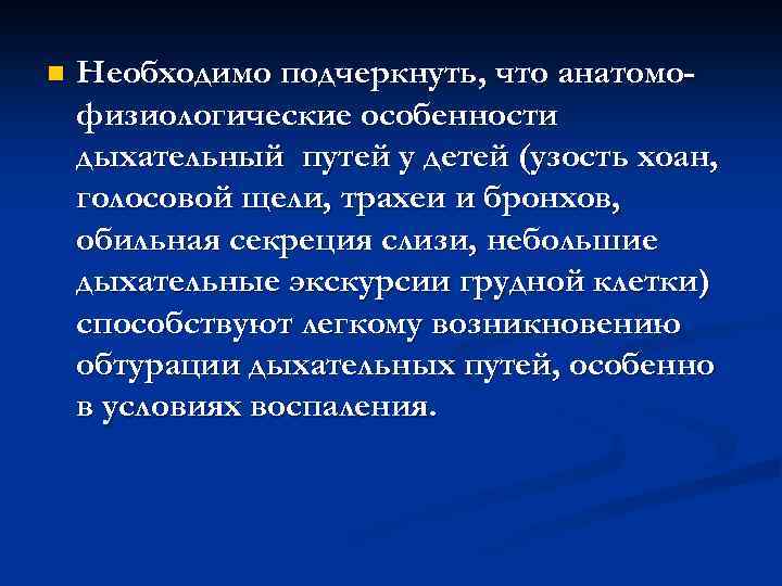n Необходимо подчеркнуть, что анатомо- физиологические особенности дыхательный путей у детей (узость хоан, голосовой щели, трахеи и бронхов, обильная секреция слизи, небольшие дыхательные экскурсии грудной клетки) способствуют легкому возникновению обтурации дыхательных путей, особенно в условиях воспаления.