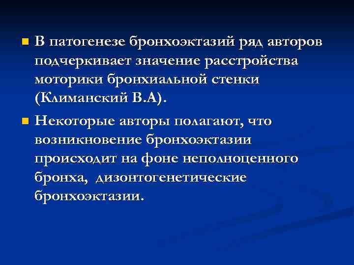 n В патогенезе бронхоэктазий ряд авторов подчеркивает значение расстройства моторики бронхиальной стенки (Климанский В. А). n Некоторые авторы полагают, что возникновение бронхоэктазии происходит на фоне неполноценного бронха, дизонтогенетические бронхоэктазии.