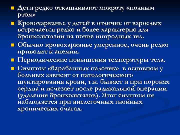 n Дети редко откашливают мокроту «полным ртом» n Кровохарканье у детей в отличие от взрослых встречается редко и более характерно для бронхоэктазии на почве инородных тел. n Обычно кровохарканье умеренное, очень редко приводит к анемии. n Периодические повышения температуры тела. n Симптом «барабанных палочек» в основном у больных зависит от патологического шунтирования крови, т. к. бывает и при пороках сердца и исчезает после радикальной операции (удаление бронхоэктазов). Этот симптом не наблюдается при внелегочных гнойных хронических очагах.