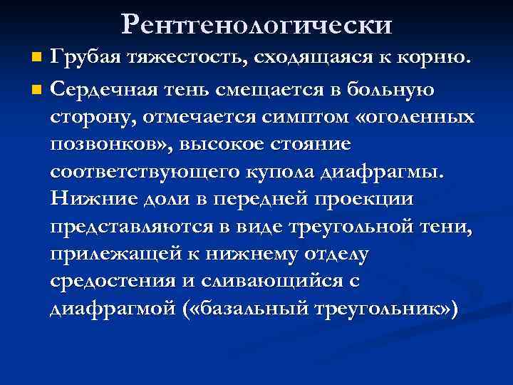 Рентгенологически n Грубая тяжестость, сходящаяся к корню. n Сердечная тень смещается в больную сторону, отмечается симптом «оголенных позвонков» , высокое стояние соответствующего купола диафрагмы. Нижние доли в передней проекции представляются в виде треугольной тени, прилежащей к нижнему отделу средостения и сливающийся с диафрагмой ( «базальный треугольник» )