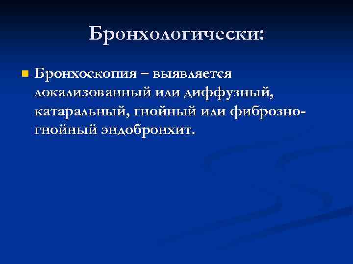 Бронхологически: n Бронхоскопия – выявляется локализованный или диффузный, катаральный, гнойный или фиброзно- гнойный эндобронхит.