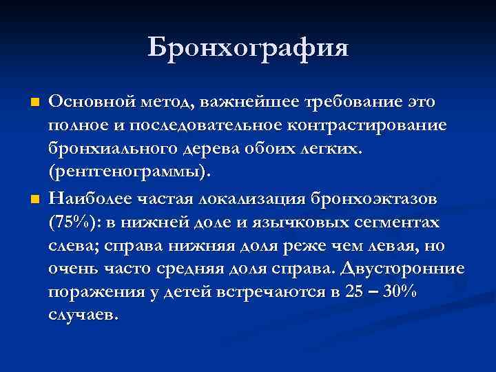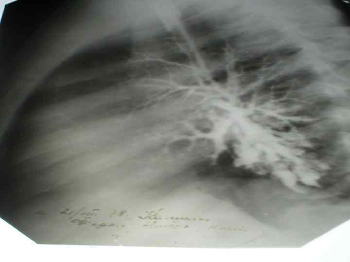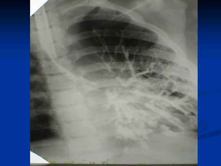 Бронхография n Основной метод, важнейшее требование это полное и последовательное контрастирование бронхиального дерева обоих легких. (рентгенограммы). n Наиболее частая локализация бронхоэктазов (75%): в нижней доле и язычковых сегментах слева; справа нижняя доля реже чем левая, но очень часто средняя доля справа. Двусторонние поражения у детей встречаются в 25 – 30% случаев.